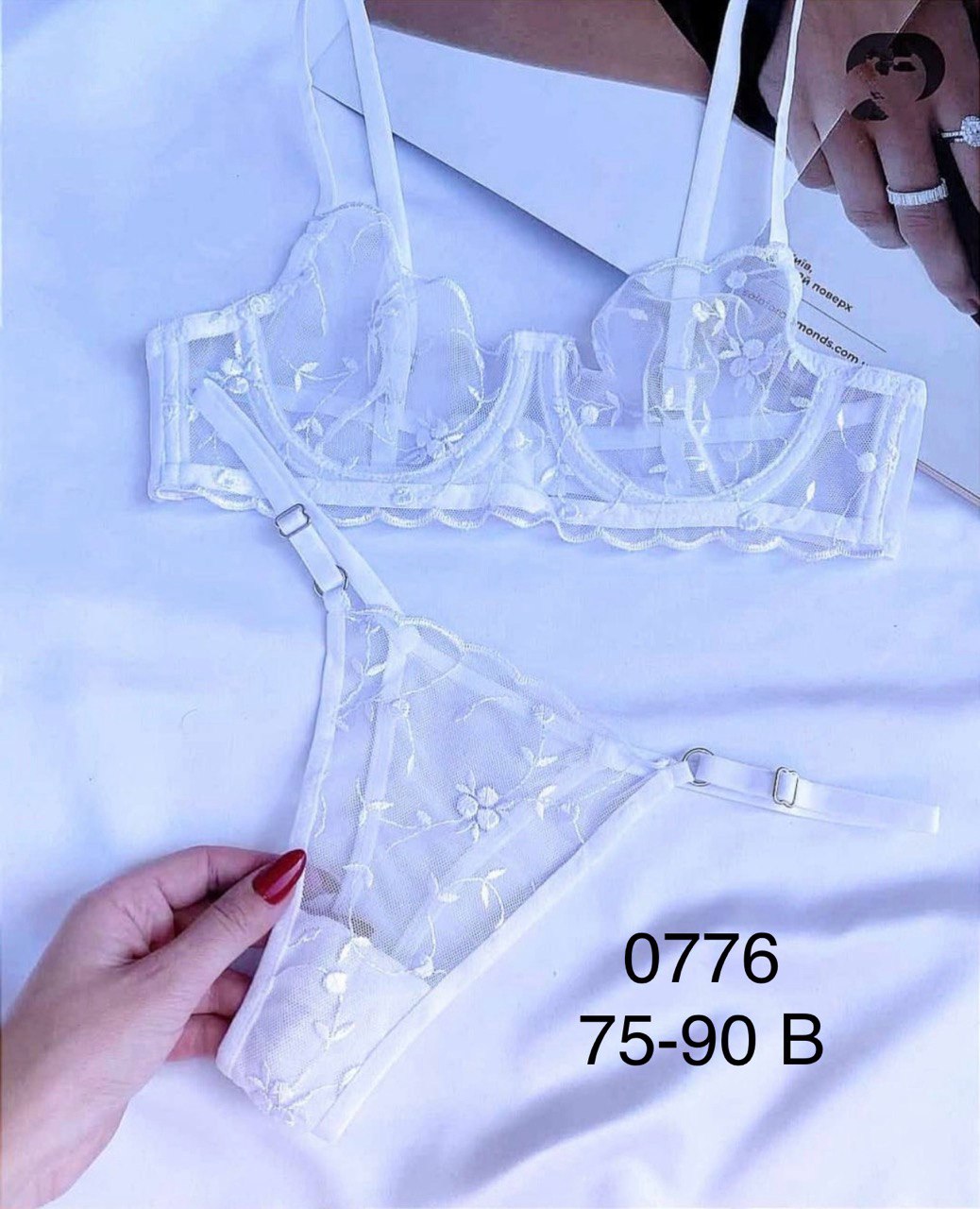 Елегантний комплект з прозорої вишитої сітки — бюстгальтер з м'якою чашкою на кісточках та трусики з регульованими зав’язками.4