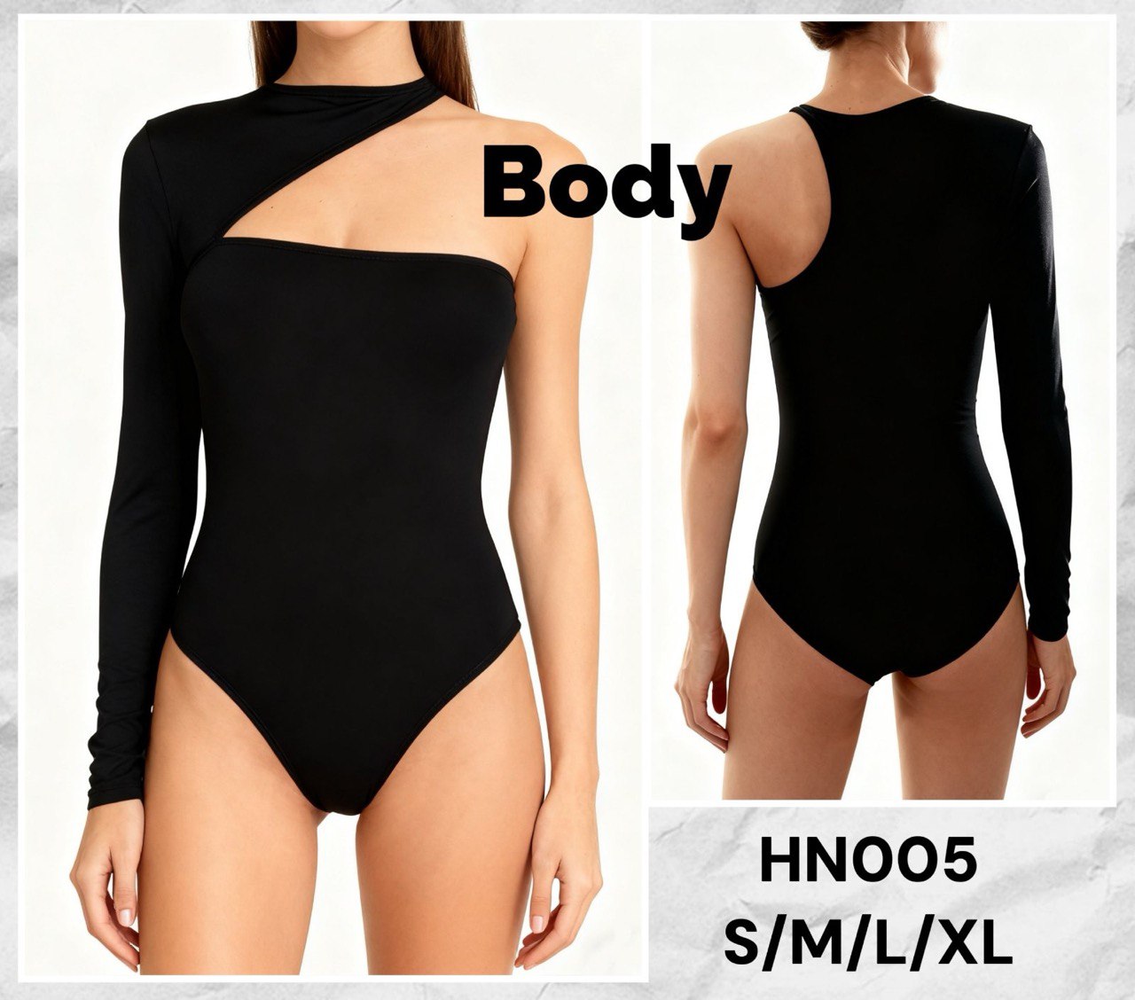 Ефектне асиметричне боді HN005 — трендова модель, яка виглядає дорого та підкреслює фігуру. Завдяки унікальному дизайну з одним довгим рукавом і відкритою лінією плеча, боді створює елегантний та сучасний силует. М’яка еластична тканина комфортно облягає тіло та забезпечує ідеальну посадку без заломів.