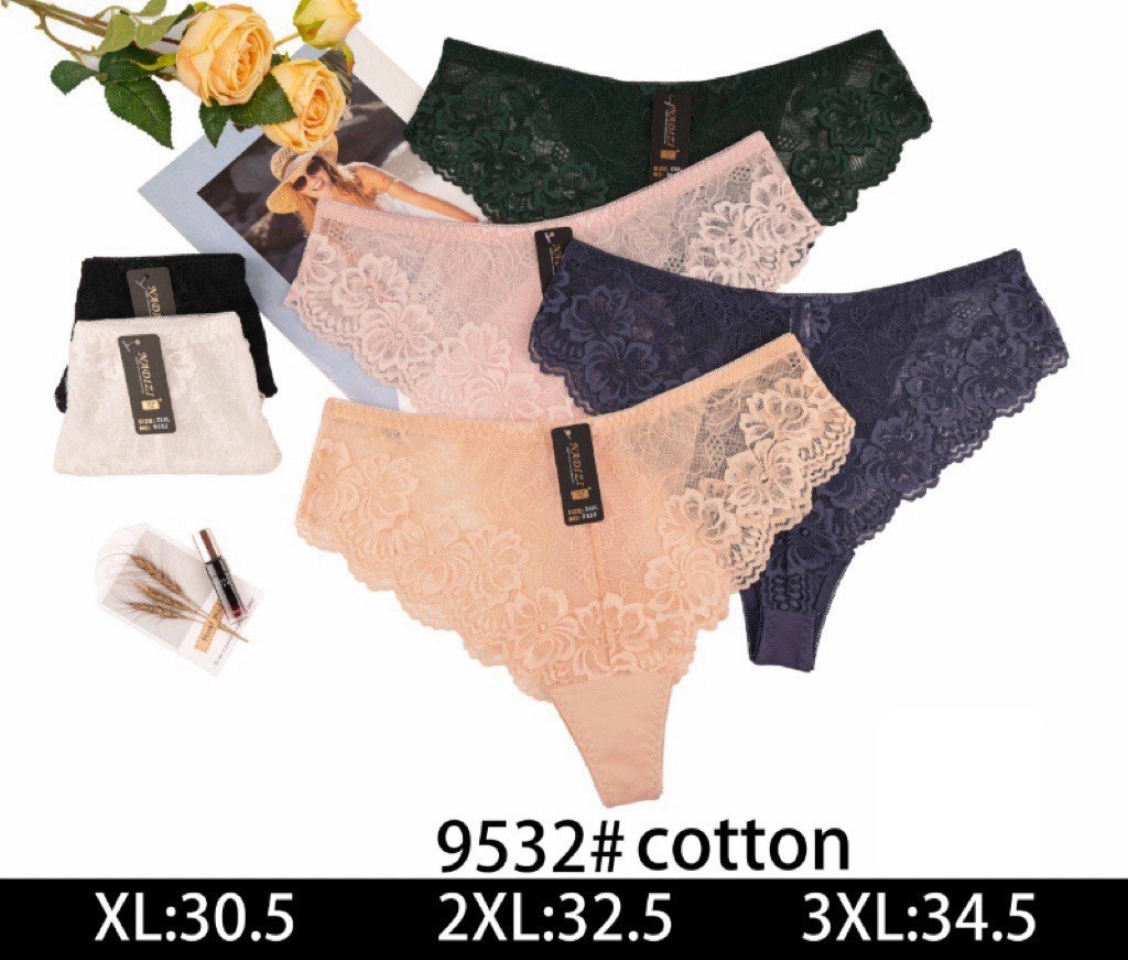 NADIZIЖіночі трусики 9532# Cotton — ніжна та стильна модель із широким мереживом по боках і по краю. Модель поєднує бавовняну основу та акуратне еластичне мереживо, що робить трусики одночасно комфортними та дуже привабливими.