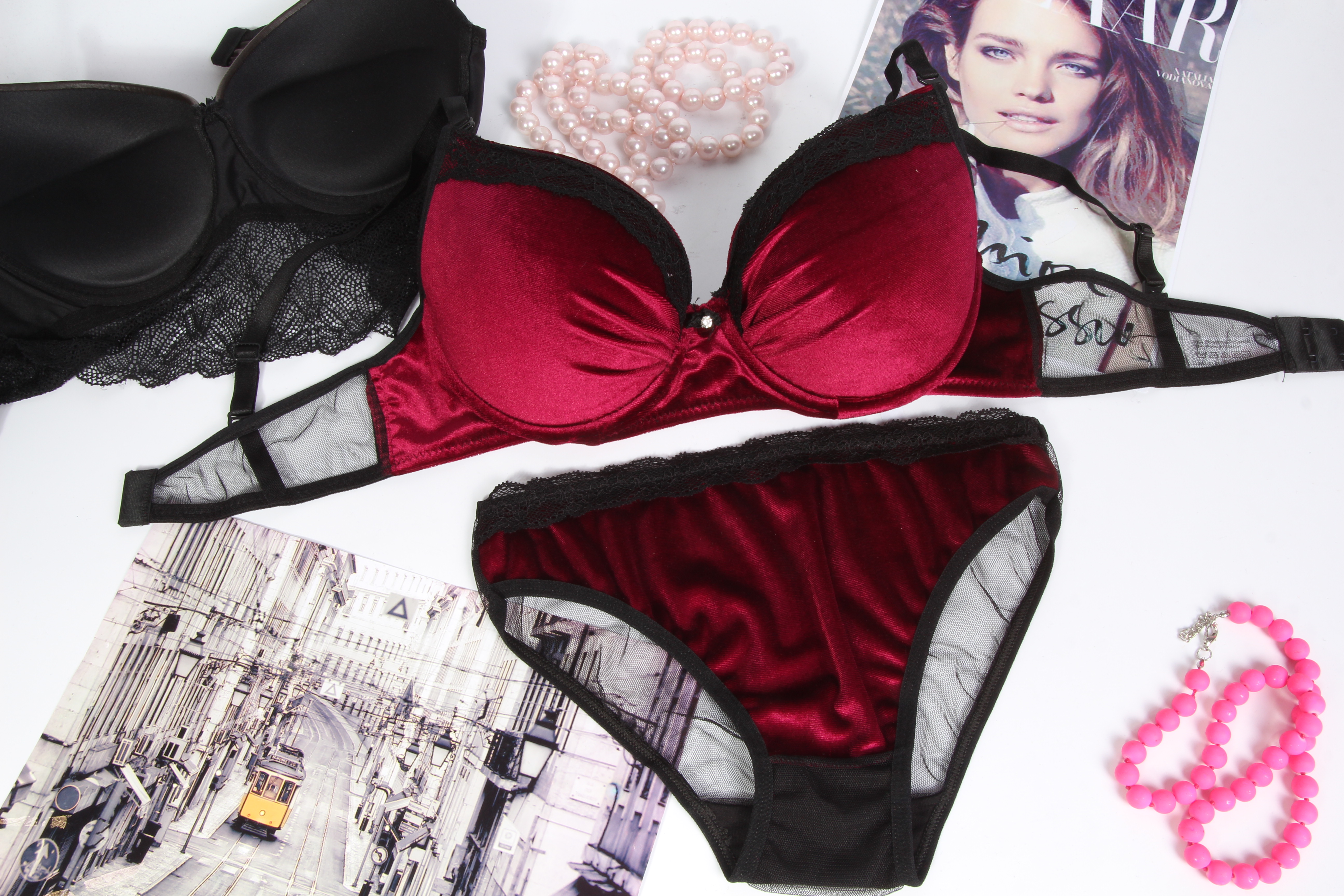 PUDRAКомпклект пошит из сочетания велюра и ажура . В комплект входит бюстгальтер без костей и трусики. Бюстгальтер с тонким поролоном, объем выполнен широкой резиночкой.. Трусики-слипы очень эффектные, пошиты из экокожи и ажура. Такой комплект станет незаменимым атрибутом, для девушек шагающих в ногу с модными трендами.