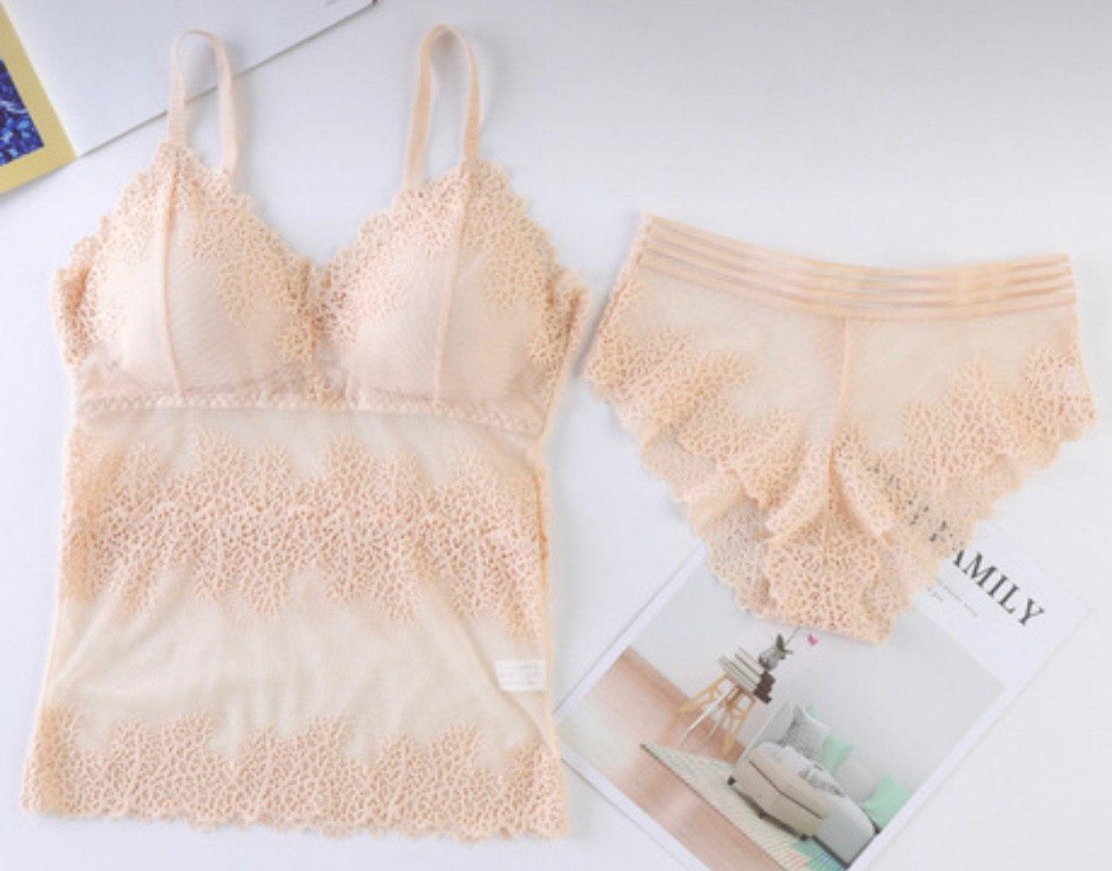 Кружевной топ удлиненный со съемным поролоном. Трусики на низкой посадке.