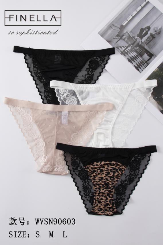 Жіночі труси FINELLA WNWN90600 (опт) – стильна модель із середньою посадкою, поєднанням гладкої тканини та мереживних вставок з квітковим візерунком.